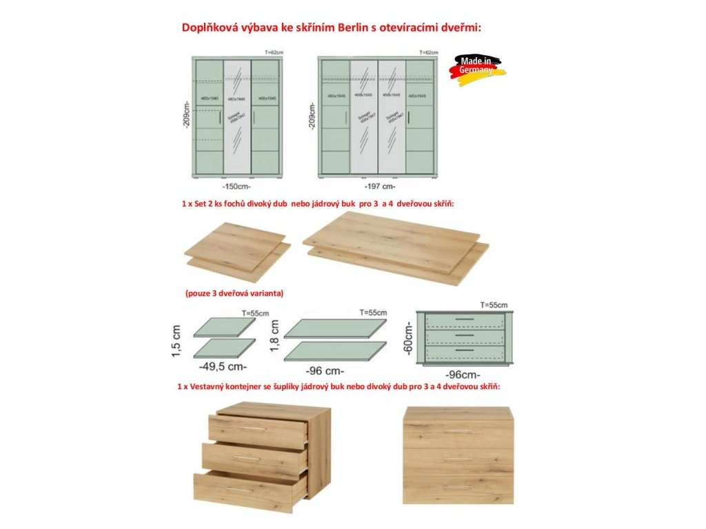 Objevte klasické kouzlo nábytku z bukového masivu, který může být ozdobou každé ložnice. Nábytek vyzařuje nadčasovou eleganci a bez námahy se hodí do různých stylů interiérového designu. Ložnice z jádrového buku masiv navazuje na a zároveň rozšiřuje nový výrobní program Berlin jádrový buk masiv. Teplý bukový odstín dodá každé místnosti útulnou a příjemnou atmosféru. Přední části nábytku jsou vyrobeny z masivního bukového dřeva (průběžné lamely) ošetřeného přírodní voskovou politurou. Korpusy a vnitřní části nábytku jsou z kvalitní tvrzené melaminované dřevotřísky ve stejném dekoru. U postele je kompletně z masivu čelo, horizontální lišty + vysoké nožičky (za příplatek). Nábytek je standardně vybaven plynulým a tichým dovíráním dvířek a šuplíků Soft Close, úchytky jsou kovové lakované. U nábytku je použito kvalitní a bezproblémové kování od předních světových výrobců. Ke skříním je možné dokoupení vnitřního vestavného kontejneru na spodní prádlo se 3 ks zásuvek na kolejničkách v ceně 8.499 Kč + setu 2 ks menších fochů v ceně 1.299 Kč a setu 2 ks větších fochů v ceně 1.999 Kč viz. poslední foto (případný zájem prosíme uvést do poznámky v objednávce). Noční stolky a postel v provedení jádrový buk masiv je možné dovybavit vysokými nožičkami ve skandinávském stylu. Použití vysoce kvalitního dřeva jako hlavního materiálu zajišťuje nábytku odolnost a stabilitu. Každý detail ložnice Berlin v jádrovém buku masiv je pečlivě zpracován, aby byla zaručena bezpečnost a pohodlí. Důraz je především kladen na čisté linie a přirozenou krásu materiálů. Zažijte dokonalou kombinaci designu a funkčnosti a objednejte si ložnici Berlin Germany ještě dnes!