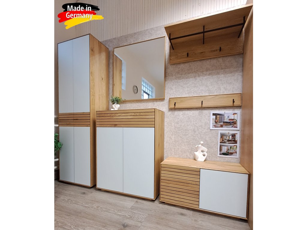 Jedná se o nový a kvalitní německý výrobní program, který vás doslova pohltí svou širokou nabídkou a elegantním nadčasovým designem. Korpusy nábytku jsou vyrobeny z přírodního masivního divokého dubu, z průběžných masivních lamel. Přední, pohledové části nábytku jsou z masivního divokého dubu v kombinaci s dvířky s bílým matným (saténovým) sklem. Veškeré masivní dubové části jsou ošetřeny kvalitní voskovou politurou (olejováním), která zajišťuje nábytku dlouhou životnost a příjemný design. Otevírání a zavírání dvířek je řešeno moderním bezúchytovým systémem click clack, zadní stěna nábytku je dýhována ve stejném provedení jako zbylé části. U nábytku je použit velice kvalitní spojovací materiál (viz. poslední fota). Veškerý nábytek je včetně kompletního spojovacího a upevňovacího materiálu.